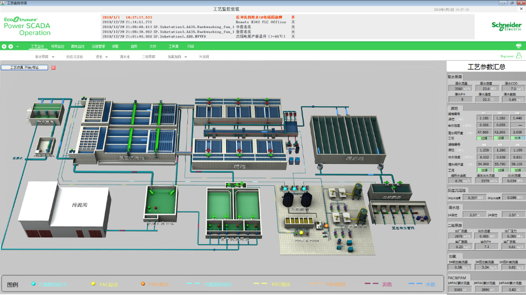 采用污水處理工藝優化與控制軟件(以下簡稱:ProSee)針對全廠工藝運行進行建模,為污水廠的運行管理提供運行效果預測、方案決策支持、工藝優化等功能。通過對實際污水廠建模,一方面可為污水廠的運行管理提供運行效果預測、方案決策支持、工藝優化等服務;另一方面可對新/擴改建污水廠的工藝可行性進行驗證,提高改造方案的科學性。ProSee基于污水廠生物處理工藝流程建立數學模型,以運行報表記錄的進水歷史數據,或在線監測儀表的進水實時數據作為模型的輸入參數,對污水廠的各種運行狀況進行診斷,優化關鍵運行參數,滿足污水廠出水水質達標和降耗的要求。